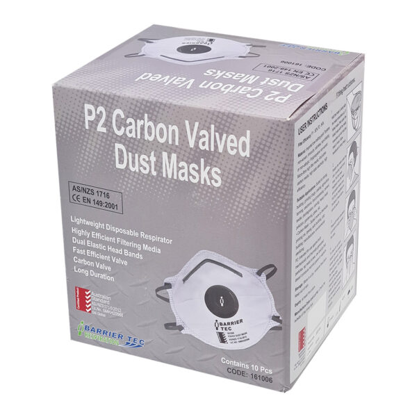 This valved P2 dust mask with active carbon filter is part of the Barrier Tec disposable respirator range. This is the economical choice for respiratory protection against a range of airborne particles with nuisance organic vapours